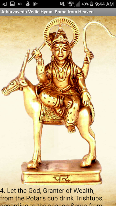 This is an ancient hymn from the Vedic Hindu Atharvaveda, translated into English in a style similar to the King James Bible. Each hymn reveals many fascinating aspects of ancient Indo-Aryan culture, history, and religion. Great for meditation, bhakti, praise, or scholarly study! This particular hymn invokes Soma from heaven during a Vedic sacrificial offering (Yajna), and honors God in the form of Indra, Agni, and "Granter of Wealth".