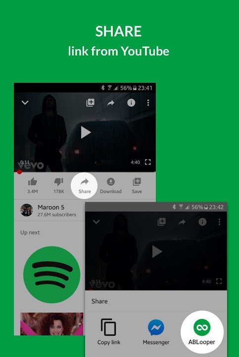 Loop: You are learning a new guitar lick to a song, watching your favorite musician on YouTube? Share the video with the ABLooper app and manage your learning. Loop selected parts and practice them to perfection!