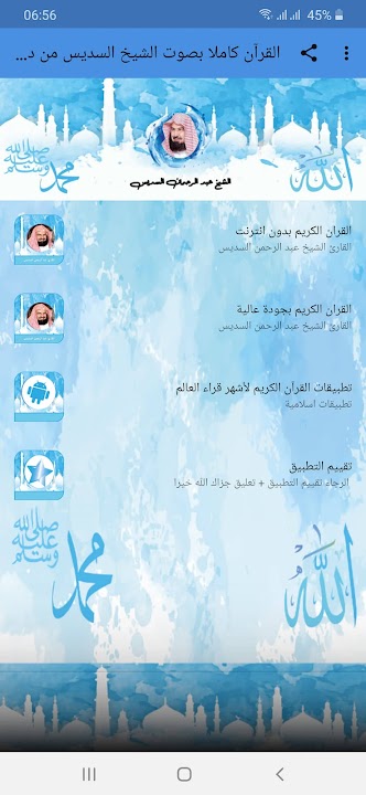 بعد تنزيل التطبيق يمكنك الاستماع إلى سور القرآن الكريم بصوت الشيخ عبدالرحمن السديس مجانًا في أي