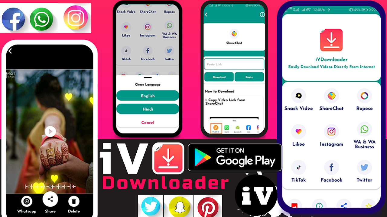 iV Downloader All In One Status Saver is an Android All Social Media Video and Image Downloader App. You can Save Facebook, Insta, Whatsapp Stories and TikTok, MxTakaTak,SnackyTakatak, Moj, Josh, Chingari, Mitron, Sharechat, SnackVideo, Roposo, Likee, Whatsapp, WA Business, Twitter, and Instagram Videos and Images, Reel with All In One Status Saver without watermark.
