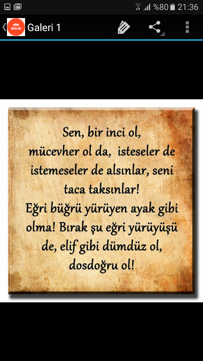 ağır sözler uygulamamız tamamen ücretsiz olup, telefonunuzu fazla yormaz. Uygulama içerisinde kapak sözler, damar sözler, laf sokucu sözler, sert sözler gibi içerikler bulunmaktadır. ağır sözler uygulaması gerek çeşitli sosyal media gerekse haberleşme ve mesajlaşma programları ile paylaşım özelliğine sahiptir. Uygulamamızdaki en güzel sözleri dilerseniz sosyal medyadaki takipçilerinizle paylaşabilirsiniz. İsterseniz uygulamamızdaki anlamlı sözleri mesajlaşma programları aracılığı ile sadece belirli kişilerle paylaşabilirsiniz. Umarız sözler uygulamamızı beğenirsiniz. ağır sözler uygulamamıza, kullandıktan sonra oy vermeyi lütfen unutmayın..