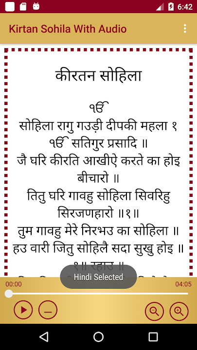 Kirtan Sohila With Audio Guru Nanak Dev Ji, Guru Ram Das Ji and Guru Arjan Dev Ji - contributed five shabads in this holy Kirtan Sohila bani. Kirtan Sohila is a night prayer. This app connect new generation with Sikhism.