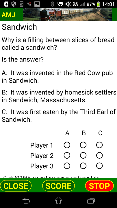 You simply select your train route from those available and enter a few details about where you are sitting. You will need a wi-fi or mobile connection to download the data when you start, but the app then tracks your location using GPS, and you just wait for it to pop up and invite you to read about the place you are passing. Optionally, there may also be a simple quiz, with a multiple choice question for each place, to keep you entertained; the app tracks the answers for up to three players and allows you to see your score at the end.