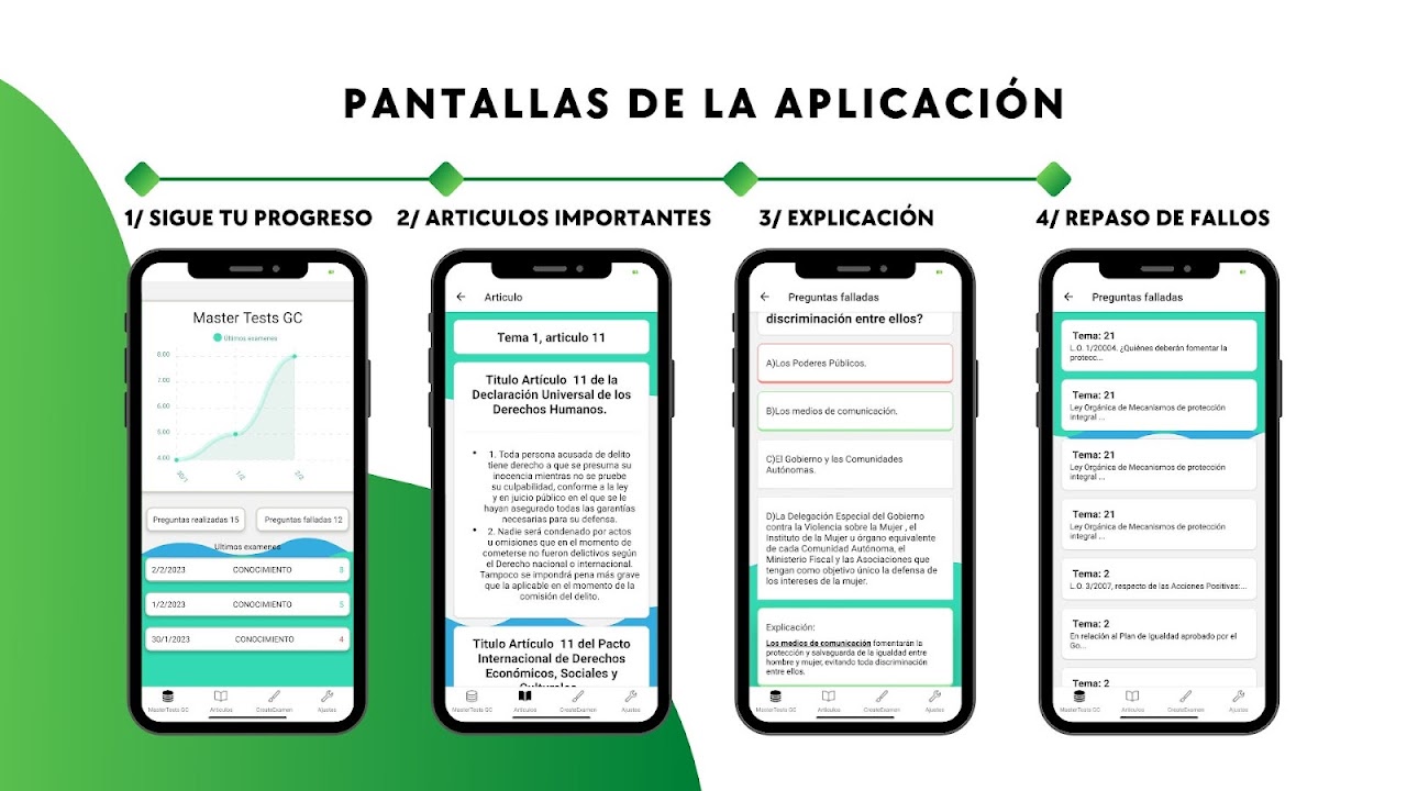 The app has a management of your exams, to be able to see your progress as well as reflect your weaknesses in your Civil Guard oppositions.