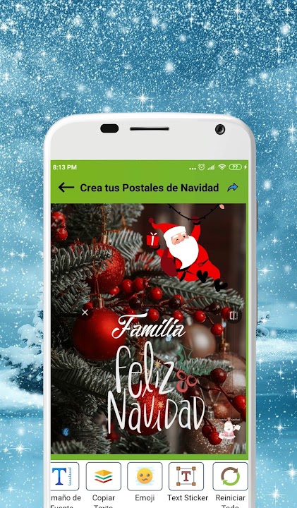 Pues ya encontraste la app que estabas buscando, descarga ya Postales de Navidad y descubre la variedad de contenido que tenemos para que puedas crear diferentes Tarjetas de Navidad para compartir con tus amigos y seres queridos, desear feliz navidad siempre ha sido un acto de demostración de cariño y amor con las personas que nos rodean por eso explora entre nuestra variedad de imágenes de fondos navideños y Stikers para crear mensajes de navidad personalizados y enviarlos a cada persona que desees, puedes cargar también tus fotos propias y sobre ellas escribir tus propias frases de navidad.