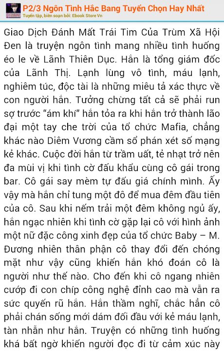 Chúc các bạn có những phút giây đọc truyện vui vẻ trên Ebook Store Vn. Đừng quên Comments cảm xúc của bạn về ứng dụng Ngôn Tình Hắc Bang Tuyển Chọn Hay Nhất Phần 2/3 và ủng hộ 5 sao để chúng tôi phát triển những ứng dụng mới trong tương lai nhé. Mọi đóng góp ý kiến của các bạn sẽ giúp chúng tôi phát triển hoàn thiện hơn về ứng dụng.