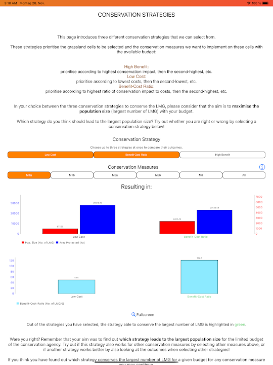 This is a teaching app which explains the principles of how to conserve species best with a limited budget (“cost-effectively”). We show that to achieve cost-effectiveness, the selection of conservation sites and conservation measures has to take into count both their costs and their impact on the species.