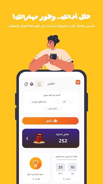 تطبيق تعليمي يحتوي على مراحل تعليمية تناسب جميع الأعمار، في كل مرحلة مجموعة صفوف ولدينا مواد لكل المراحل وأقسام فرعية لكل مادة ، هناك مجموعة أسئلة لكل قسم تستطيع تقييم أدائك وحل الاختبارات والارتقاء بمستواك التعليمي