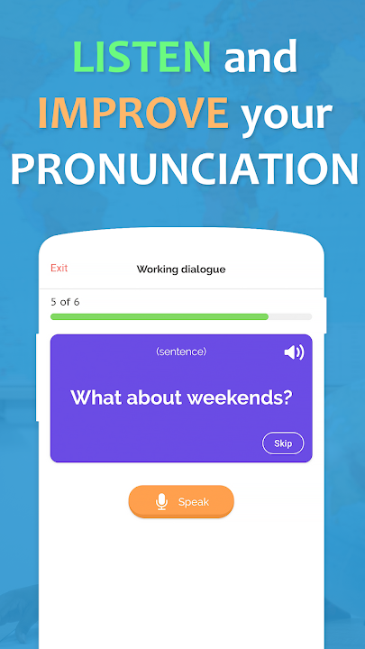 You can improve your English Speaking for IELTS, TOEFL, TOEIC exams. English dialogue exercises will help you to improve your English and British speaking skills. Practice and let app rate your English pronunciation.