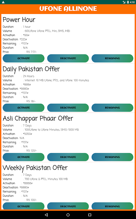 All Network Packages 2020 Pakistan is one of the best network packages apps. Easy to use and provide all network packages details and information’s in one place, like the package’s price, validity, and codes of packages for an amazing experience. All network packages bundle app is the best way to know all network packages in Pakistan easily, including Call offers, SMS offers and Internet offers! Take a break and discover the latest offers and packages with all sim network packages free 2020! You’re going to love it!