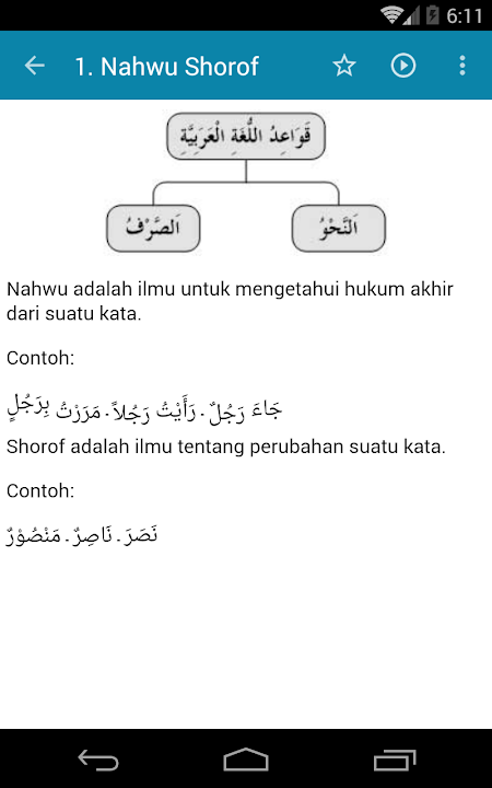 Bahasa Arab Dasar merupakan aplikasi mobile yang dibuat untuk membantu kaum muslimin dalam mempelajari ilmu bahasa arab khususnya ilmu nahwu dan sharaf. Beberapa fitur di dalam aplikasi Bahasa Arab Dasar adalah sebagai berikut:
