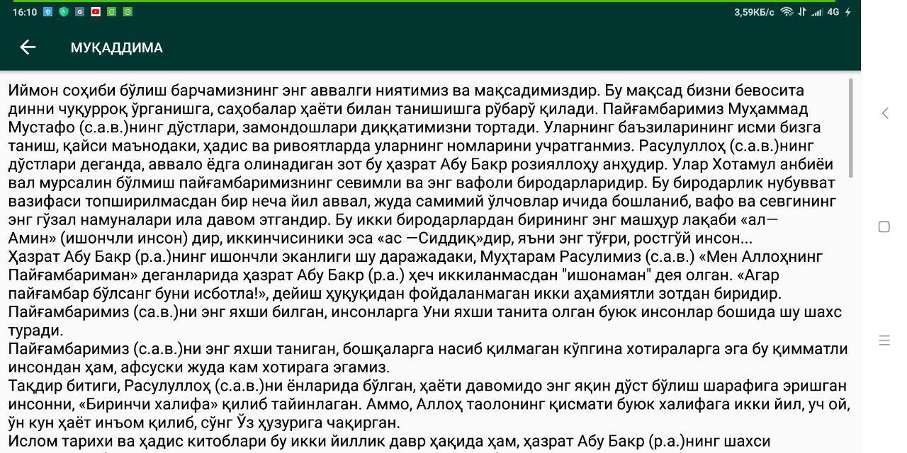 Aziz o‘quvchi, ushbu mo‘jazgina risolada siz olam—olam ma’nolarga boy bo‘lgan tarixdan voqif bo‘lasiz. Chunki, unda bashariyatga islom dinini yoygan Payg‘ambarimiz (s.a.v.)dan so‘ng ilk xalifa bo‘lmish Abu Bakr Siddiq (r.a.) haqlarida bayon etiladi. U zotning qisqagina xalifalik muddatlarida nechog‘lik ulkan ishlarni amalga oshirganlarini risolamizni o‘qigach shohidi bo‘lasiz. Hidoyat va tavfiq Allohdandir.