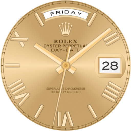 Displaying time with analog watch interface. The hour and minute hands with elegant and styling hour, minute and second hand of the MilkyWay: Rolex Day-Date Royal will give a touch of delicate design from Rolex - Swiss made watch company for your smartwatch based on the design of the Rolex Oyster perpetual Day-Date. The design will bring you the classic, thus elegant feel like watchface.