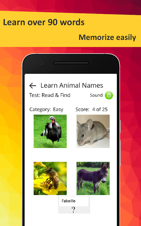 There are 100 animals in the app with real, high quality images. All images have sound files which teach how to correctly pronounce in French.