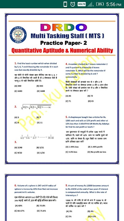 DRDO MTS V.V.I Practice Question Papers have 5 Quantitative Aptitude & Numerical Ability Practice Papers which helpful for your DRDO MTS Exam.