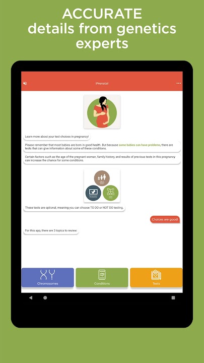 iPrenatal explains chromosomes, conditions that prenatal screening can identify, and testing options available including NIPT (noninvasive prenatal testing) and was developed by a team of doctors and genetic specialists from Roche.