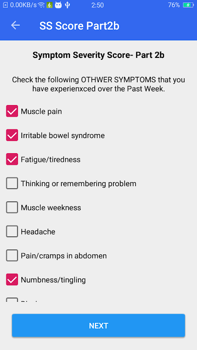By using this application you can calculate your WPI (Widespread PAin Index) scores and also symptom severity score's..