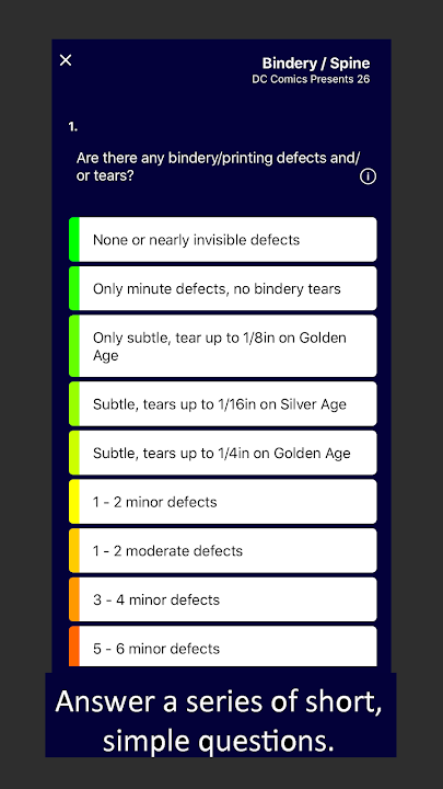 A series of short questions with multiple choices enables you to grade your comic books on-the-spot, accurately, within minutes. Grades are comparable to the third party grading companies such as CGC, CBCS, etc.