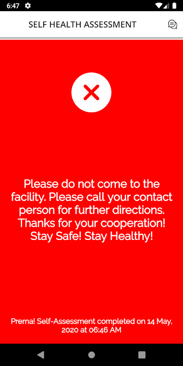 After self-declaration and self-assessment, if all symptoms are negative then app will show green screen indicating All OK. If there is any symptom then it will show red screen to Stay Safe at home today. If person will leave any information blank then it will show orange screen with message to suggest and get more medical information. App also suggests basic hygiene and social distance rules.