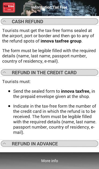 Tax-free shopping had never before been so easy. The INNOVA TAXFREE application gives you the ability to buy simply by using your Smartphone device. In addition, helps you to find the best shops that offers tax-free.