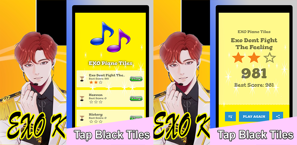 EXO Don't Fight The Feeling Piano Tiles is a game specially designed for EXO fans. it is designed with a smooth high resolution screen. No unique abilities are required to play this game, just a tap on the screen !!