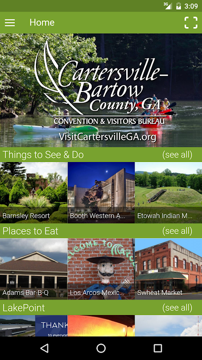 Powered by PointsMap with content created by the Cartersville/Bartow County Convention and Visitors Bureau, this app features locations and information about what to see and do, places to stay, where to dine, great shopping, and more. Create a favorites list, make reservations, contact businesses, or take a virtual tour from any mobile device. This app makes it easy for you to find what you're looking for. Contact information for the CVB and other helpful agencies is readily available.