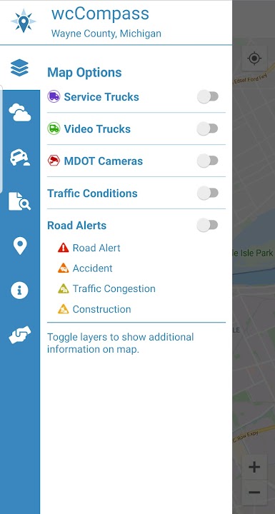 With the wcCompass mobile app you can view traffic and weather conditions, live camera feeds and follow Wayne County service trucks in real time as they plow and salt area roads. You can also report and track road hazards you see while out on Wayne County roads.