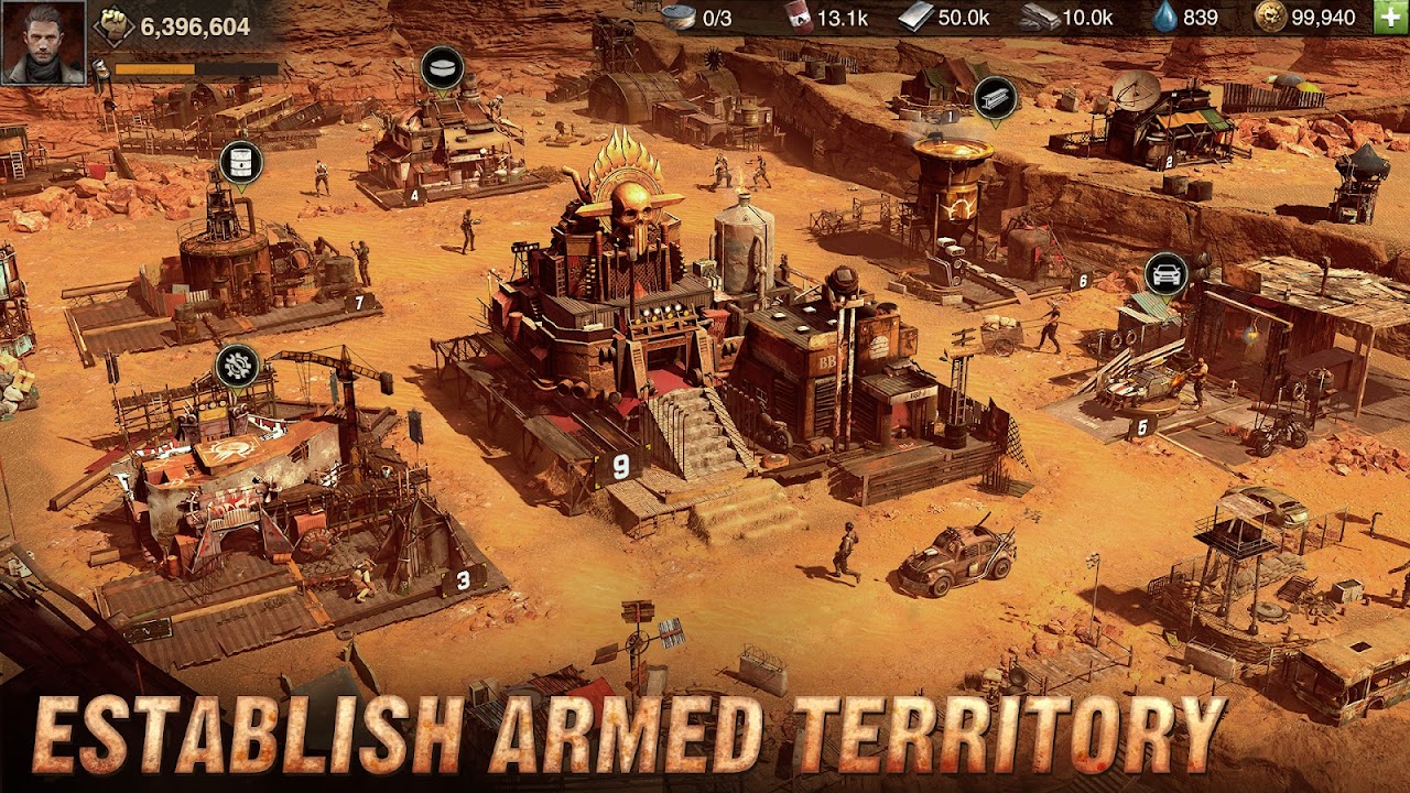 * Fight the infamous warlords and take over their camp. Establish your Base and build a new home in the wasteland. By expanding the Base, you can further develop your fortress in the desert and grow into an unneglectable power!