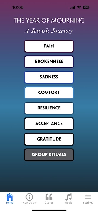 The Jewish mourning process is a voyage through pain, brokenness, comfort, resilience, acceptance, and even gratitude. This app, a companion to the book "The Year of Mourning: A Jewish Journey" from CCAR Press, offers an expansive array of resources—stories, songs, study texts, poetry, and prayers—to lovingly and patiently guide the bereaved through the first year after their loss. Each week the mourner is encouraged to focus on a particular theme to deepen their Kaddish practice. The app also includes opportunities for reflection and writing, daily reminders and inspirational quotes, and thirty-five musical recordings.