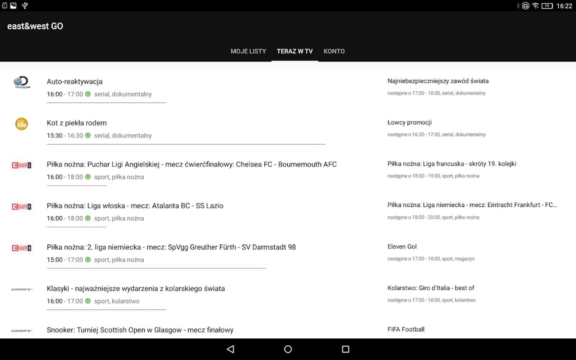 The mobile application enables subscribers East & West watch on your smartphone or tablet selected live TV channels. The new service GO east & west & east westuzyskują customers access to selected channels. The current list of available TV channels can be found at www.eastwest.com.pl