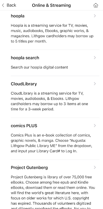 “Inspire your imagination, widen your world.” A cultural, educational, and recreational focal point for the community, Lithgow Public Library offers programming, access to electronic resources, and reference services for all. Stay connected with us on your device: manage your library account, place holds, renew your checkouts, search the catalog, sign up for programs and events, reserve museum and park passes, browse our Library of Things collection, access our variety of digital resources, contact staff for technology questions or other assistance, and more!
