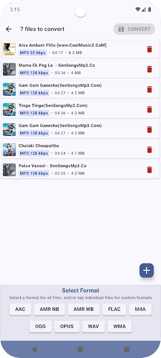 • Change between WAV, MP3, AAC, M4A, OGG, FLAC, AMR, OPUS, WMA
