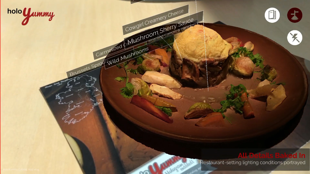 Or, if you don't have the booklet handy, virtually experience food holograms by selecting each page and pinch to zoom, drag to rotate each 3D cuisine model.