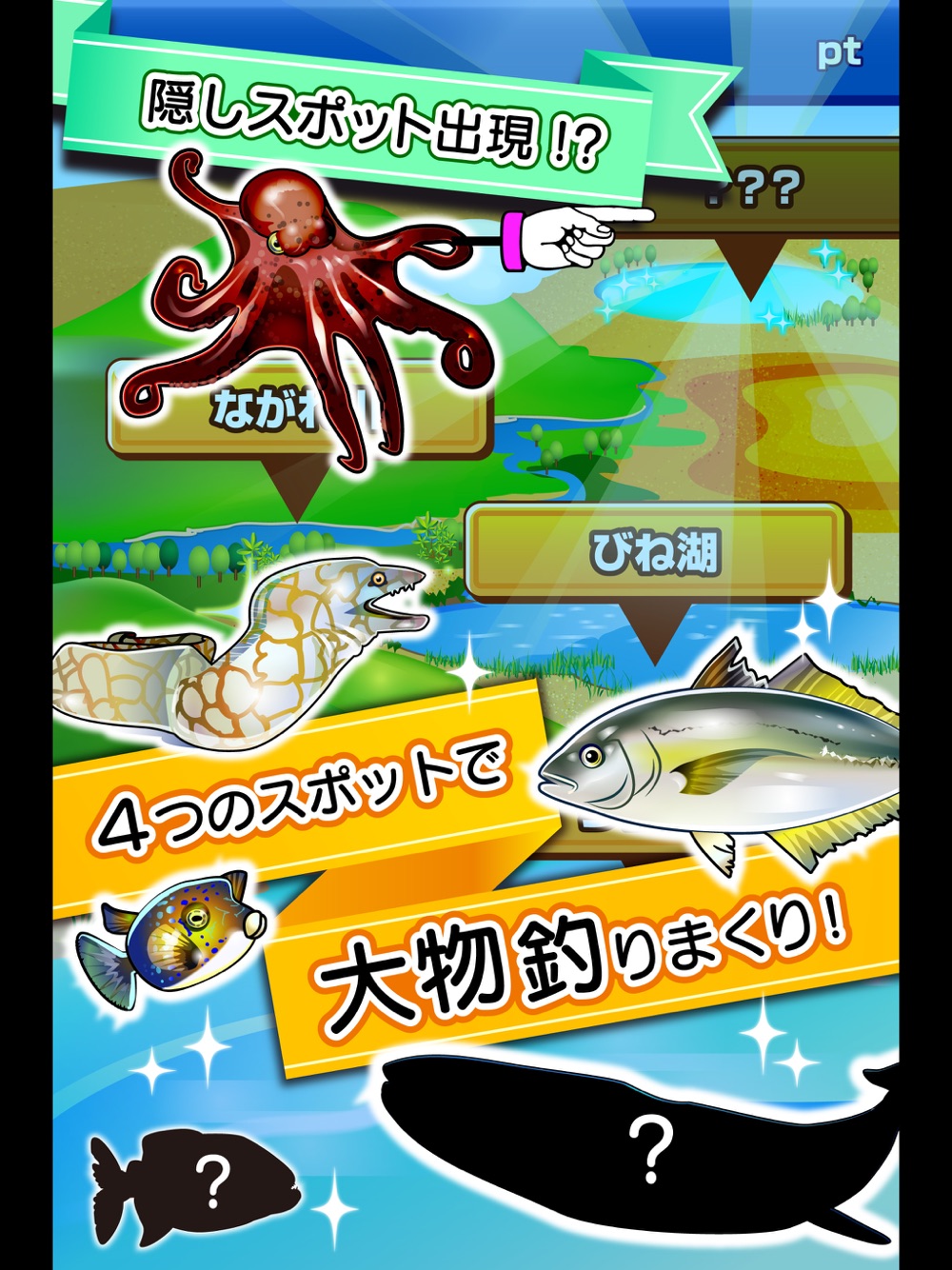 川や湖や海、さらには謎の場所でいろんな魚が釣れるよ。