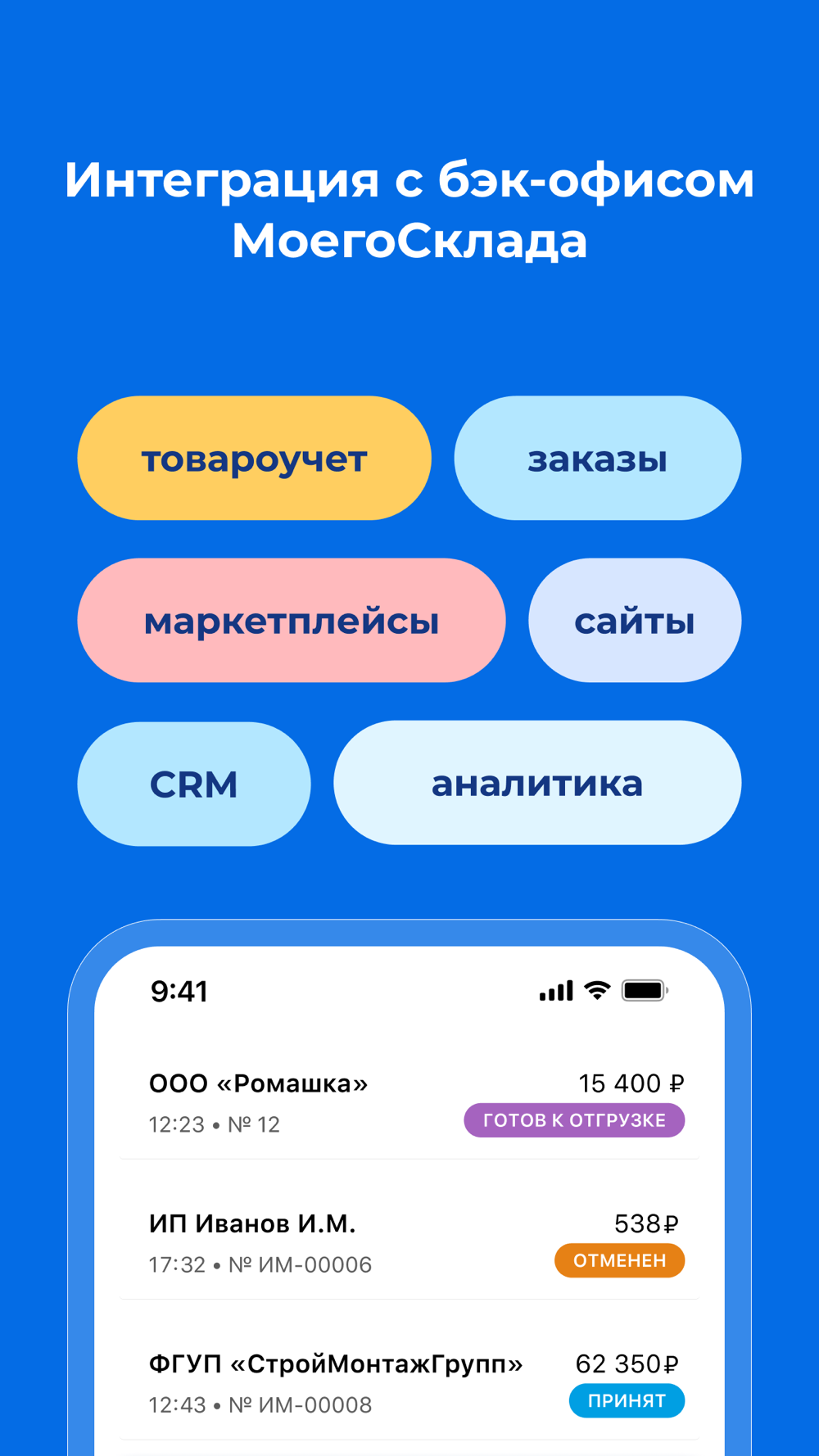 К приложению можно подключить облачный сервис МойСклад в качестве товароучетной системы. В нем вы сможете вести складской учет, планировать закупки, обрабатывать заказы вашего интернет-магазина, контролировать финансовые расчеты. Если у вас сеть торговых точек — сможете их объединить: централизованно управлять товарами и ценами, следить за динамикой выручки в режиме реального времени.