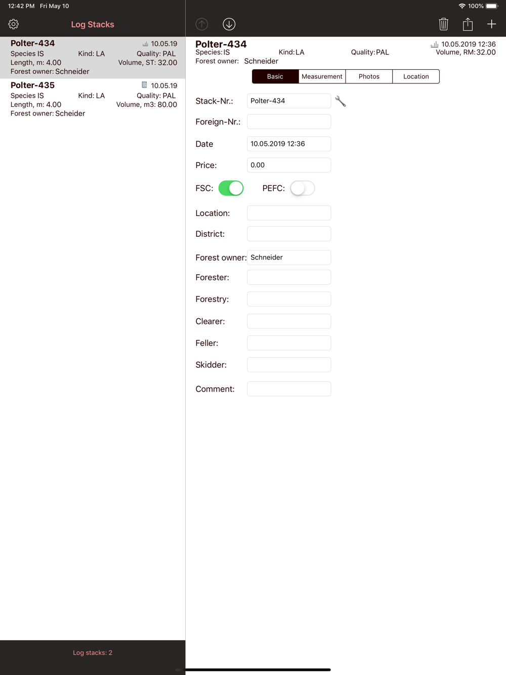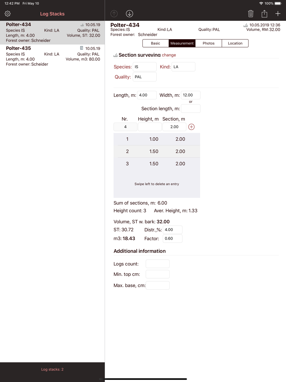 PolterApp is a user friendly mobile application for round wood measurement and inventory. It works completely offline. Beside basic data collection like woodpile owner, price, certificates, photos, geo location etc. The app features include individual trunk measurement, section measurement, estimation. Collected logging data can be exported in multiple formats, e.g. PDF, Excel, CSV, XML, KML, Email etc.