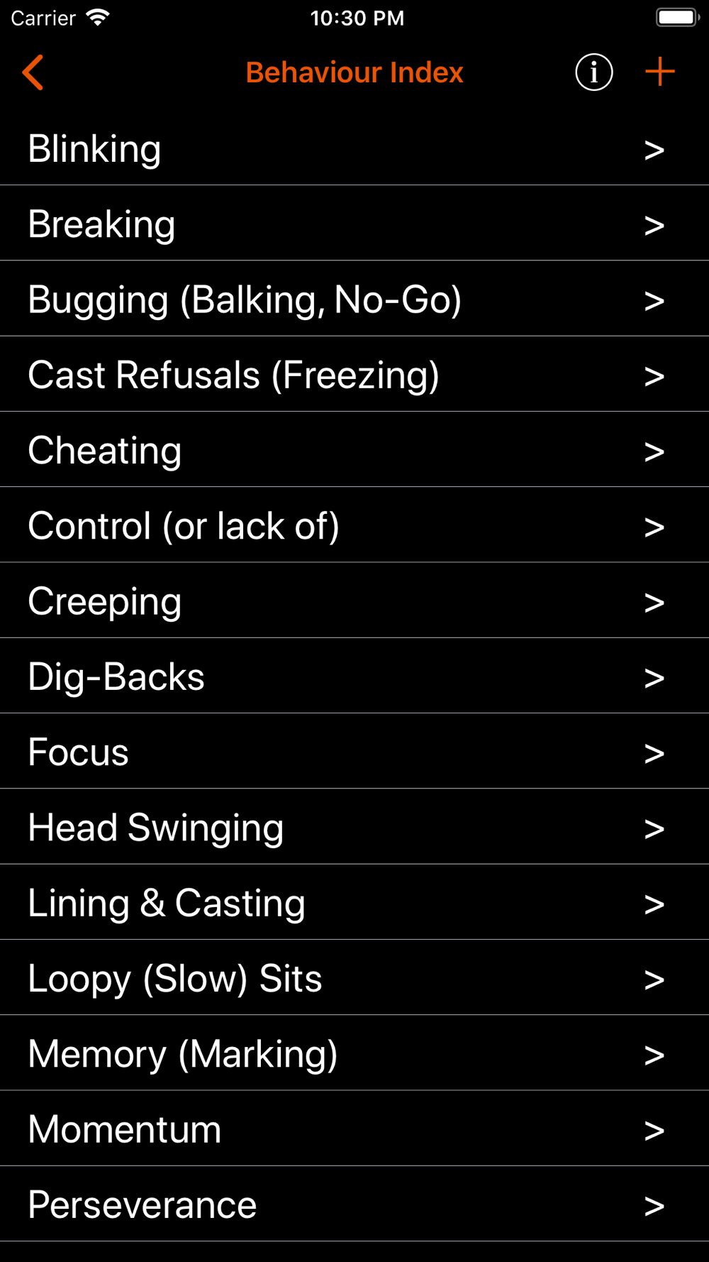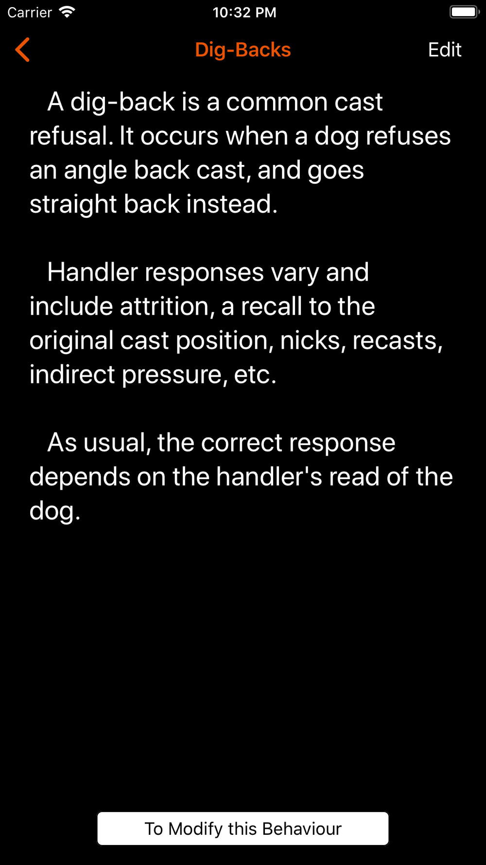 - Simply tap a behaviour listed in the index to display its description. A tap on the description screen will display specific drill(s) that can be used to encourage or discourage the behaviour.