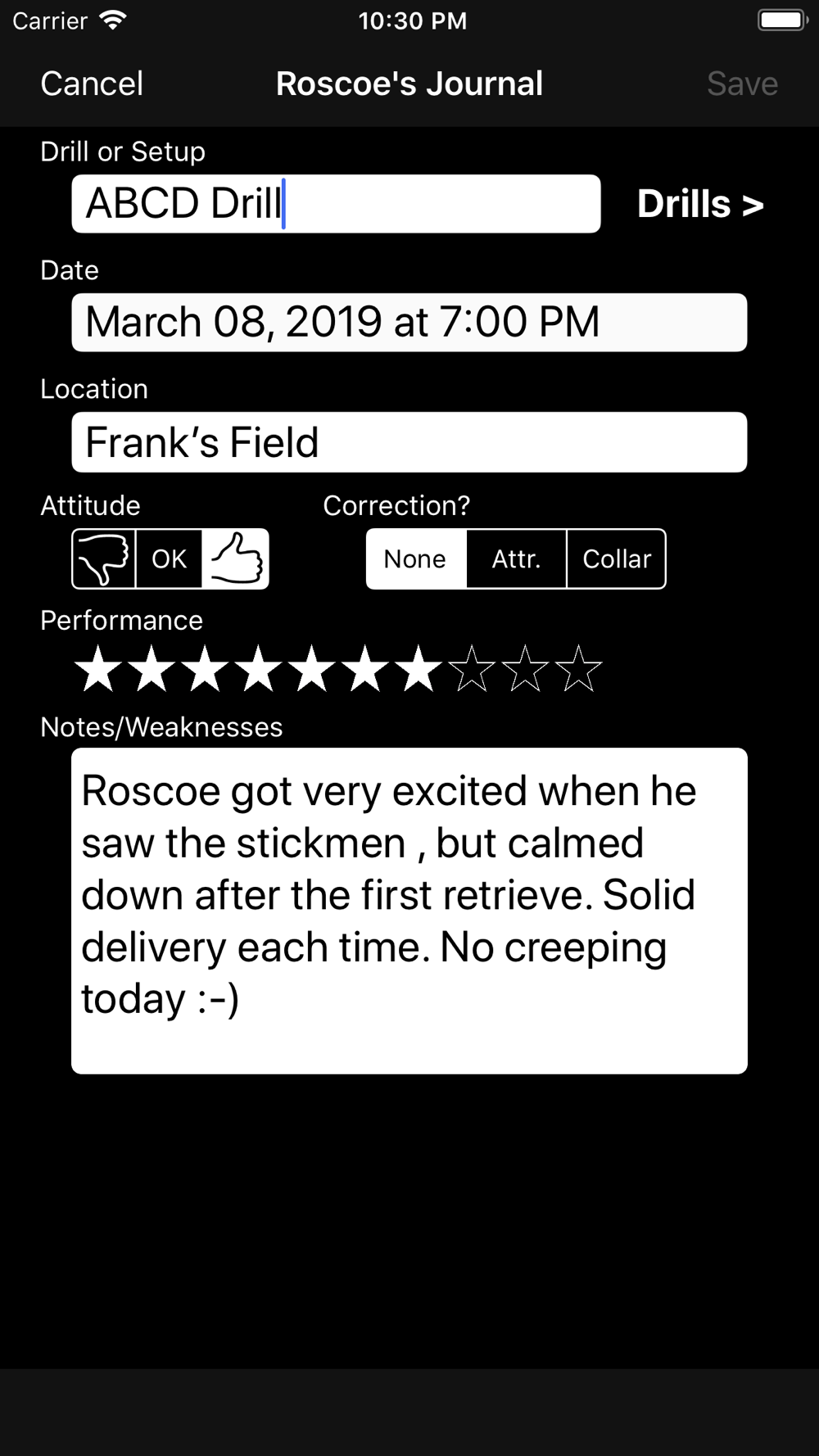 - Create a journal for each of your dogs. Each journal entry can include the name of the drill or setup, how your dog performed, the date, time, location, dog's attitude, corrections applied, etc.