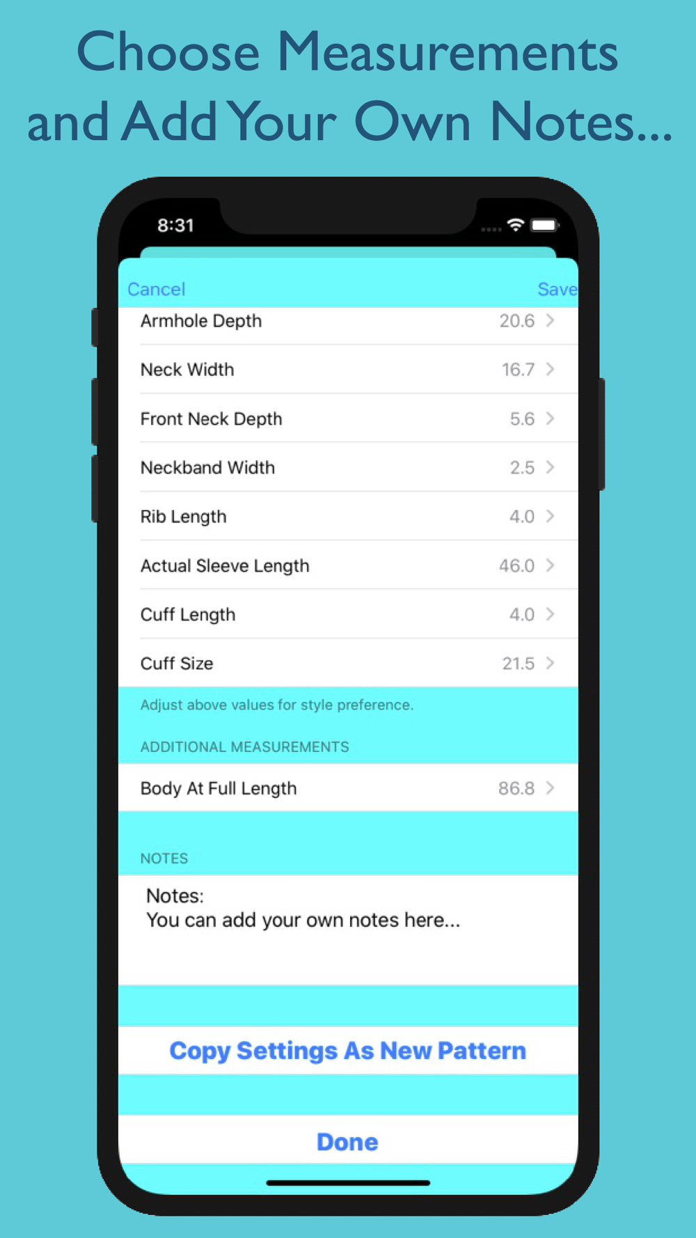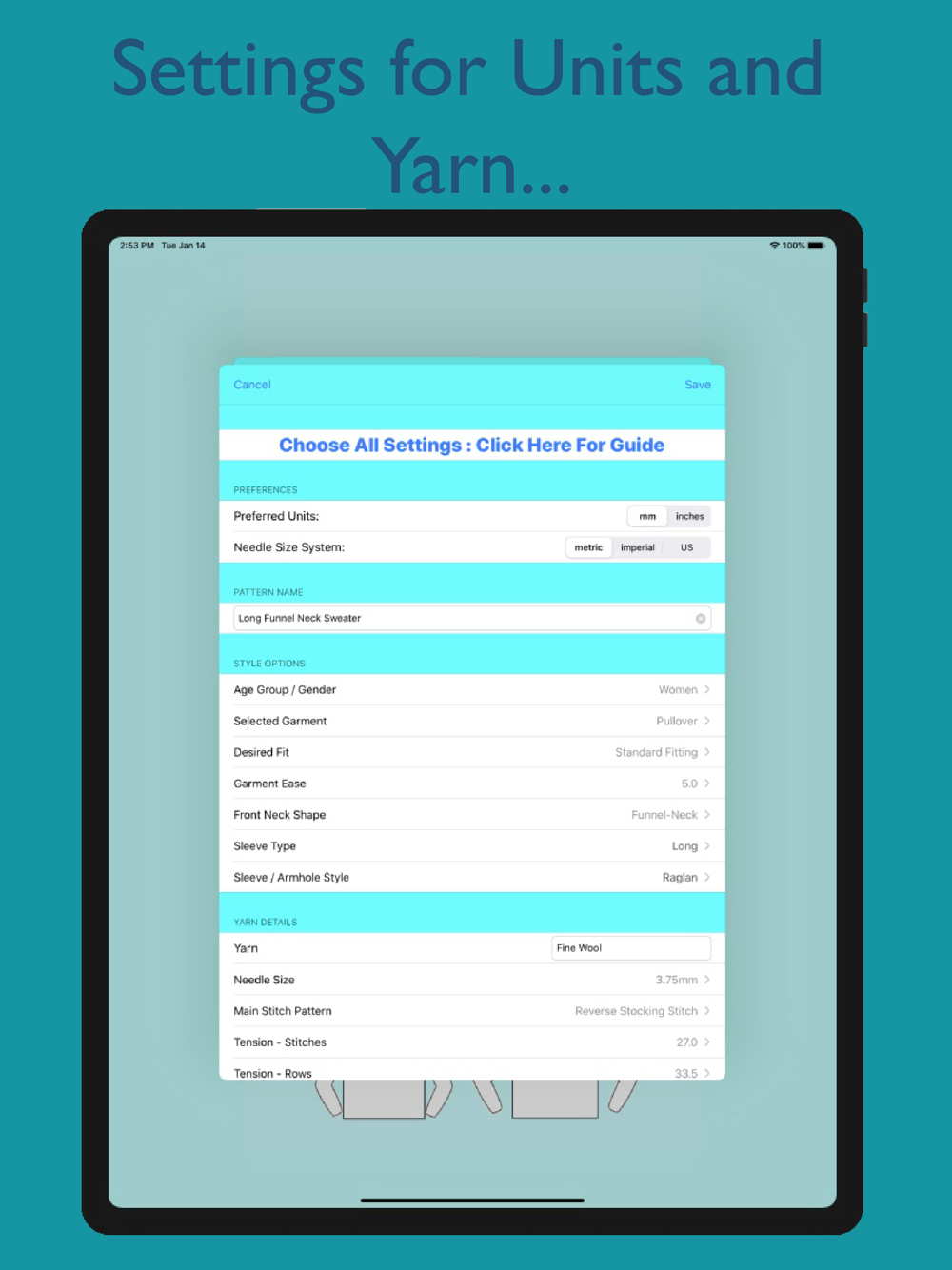 Create unlimited custom sweater knitting patterns (pullover or cardigan) with this fantastic knitting pattern app.