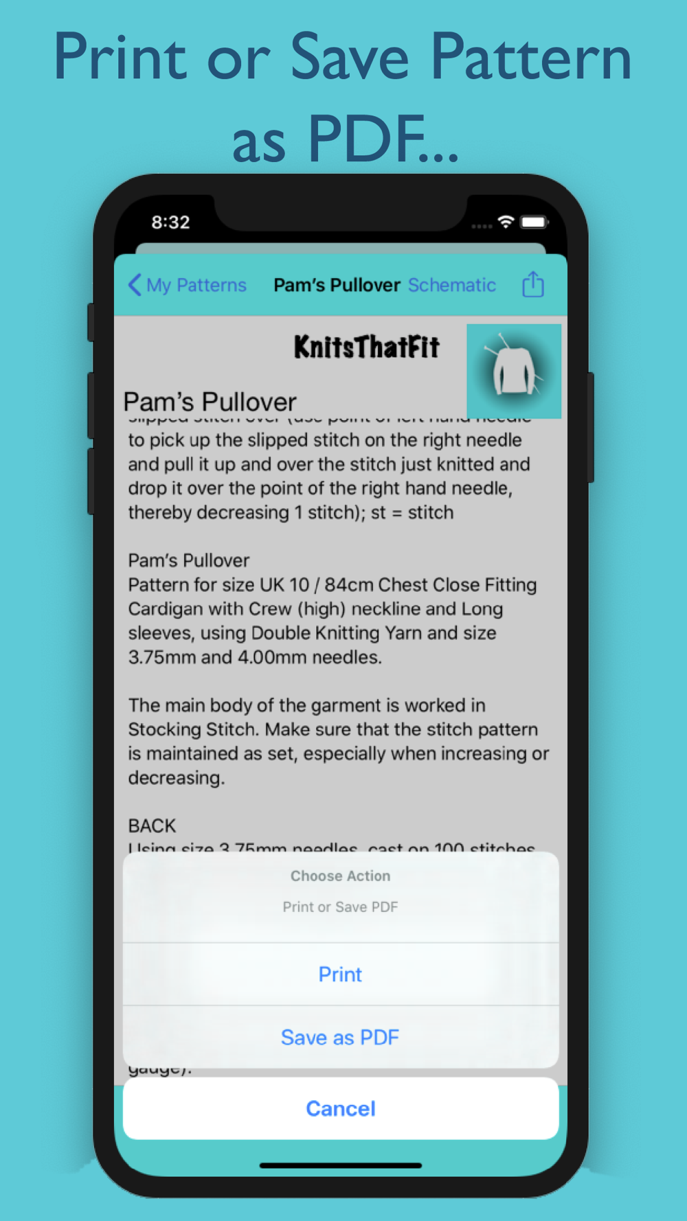 Patterns can be printed (with an AirPrint compatible printer) and saved as a PDF, which can be opened in any other compatible apps on your device.