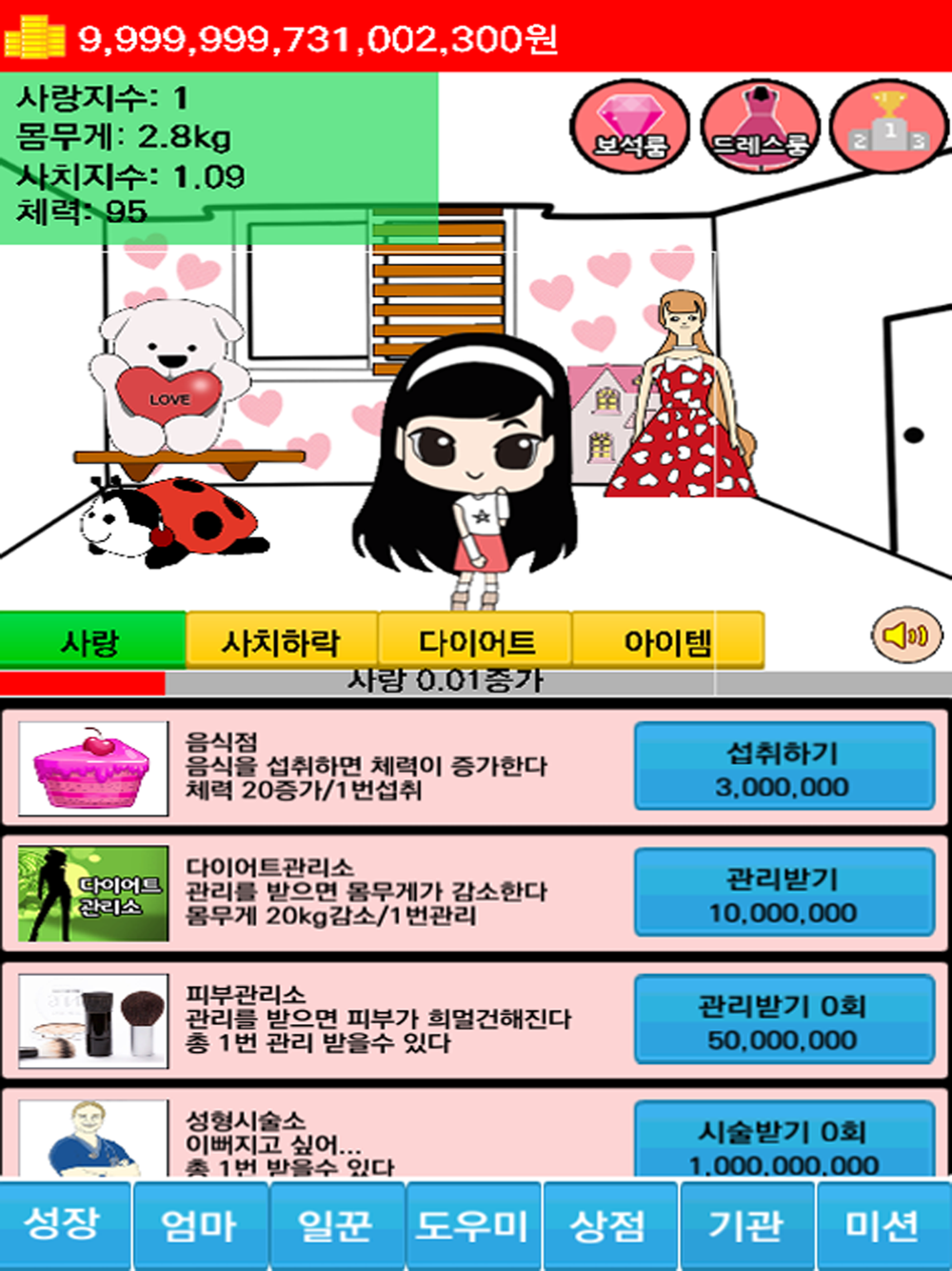 5. 사치지수는 시간이 지나면 자동으로 증가하며, 체력도 시간이 지나면 자동으로 떨어집니다.