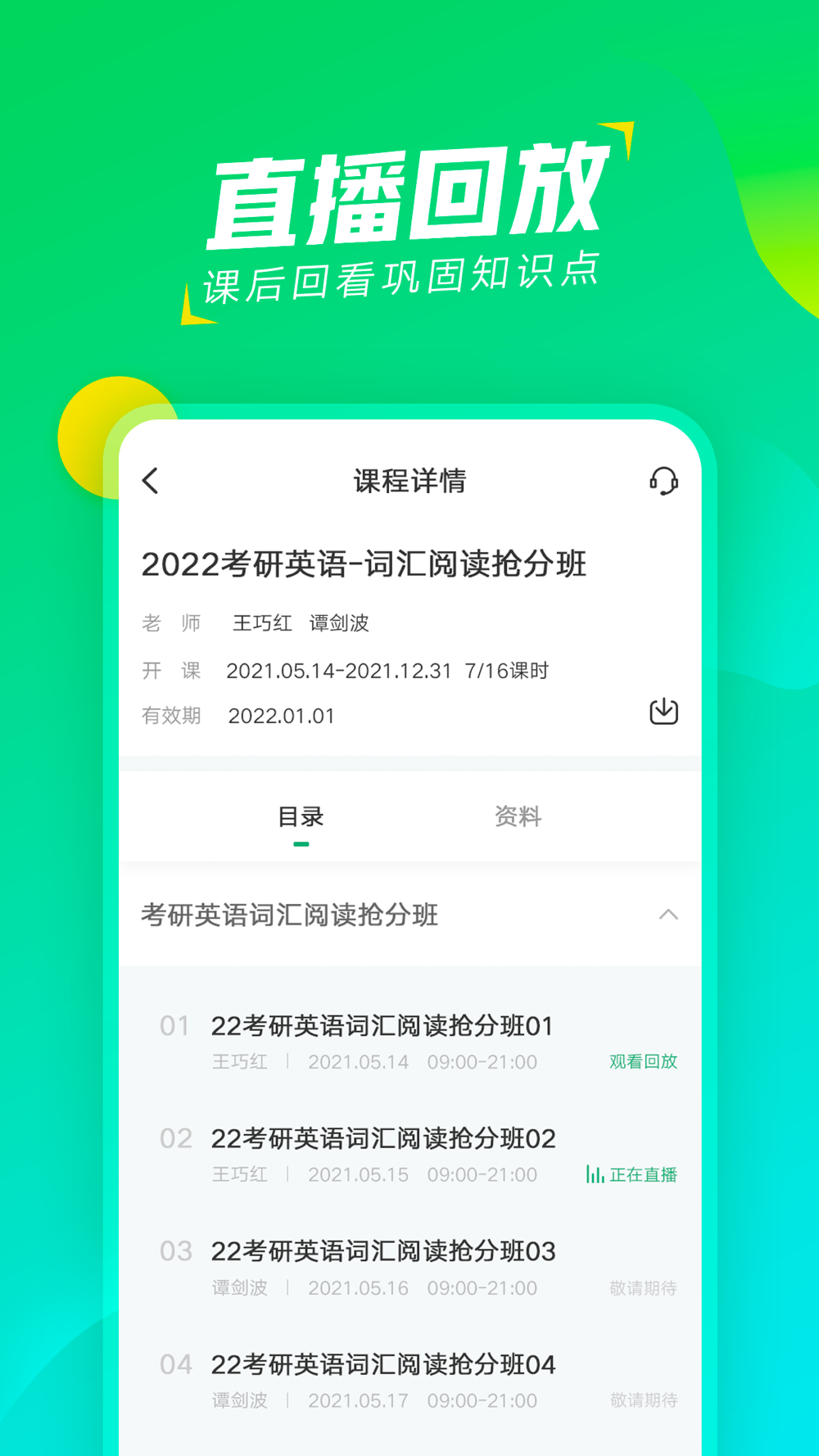 3.直播回放:每节直播课都有回放功能,学员灵活自主安排学习时间。