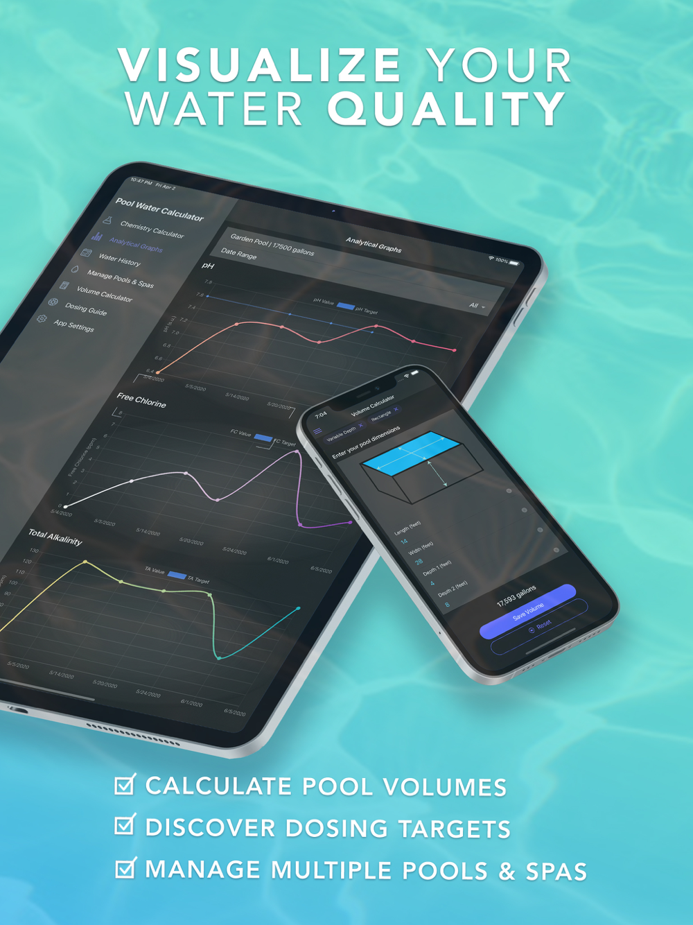 Backup or recover your water profile, history, and settings using iCloud. Find your pool volume using the volume calculator.