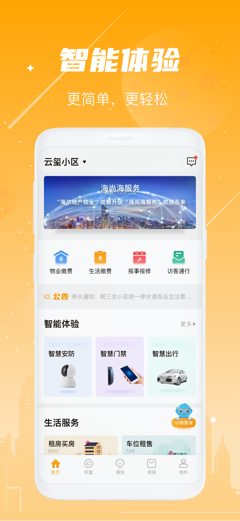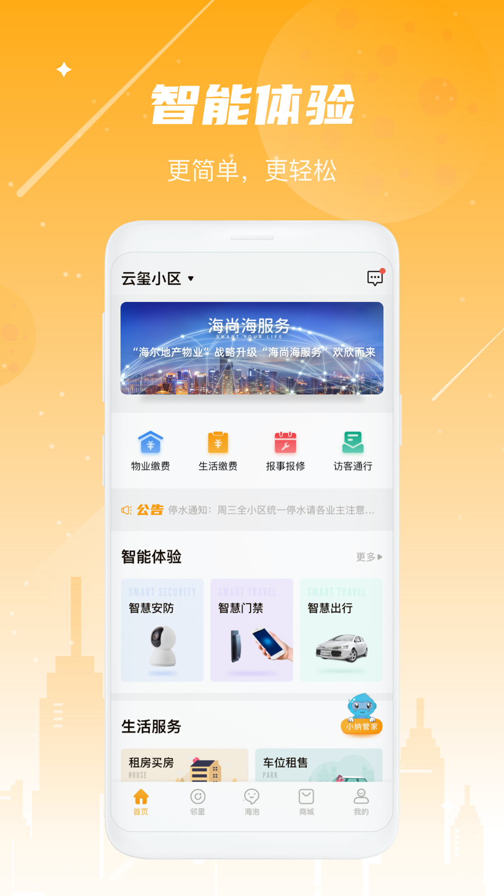 海客会 APP,青岛海纳云科技控股公司数字社区服务平台,依托海纳云AIOT,以用户需求为中心,集合智能互联功能、物业服务功能、社群交互功能,为智慧社区提供一站式物联交互体验,为用户带来最佳的社区生活体验。