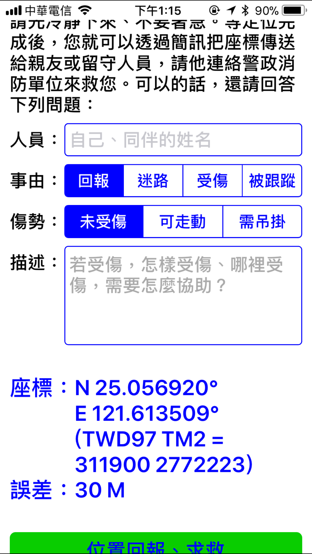 【野外求救】 讓您能在手機有訊號但沒有網路的環境下,透過簡訊把您的座標傳送給親友或留守人員,從而提升整個救援過程的效率。