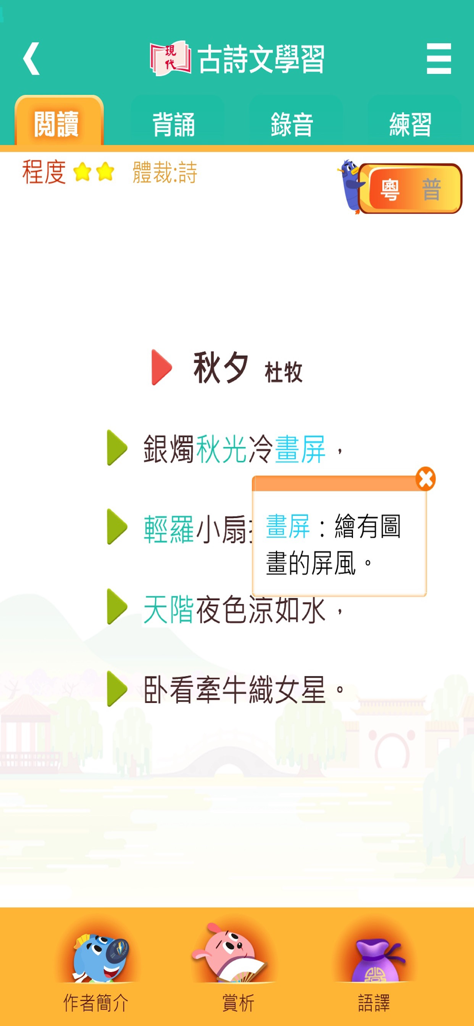 每篇古詩文均提供粵語及普通話朗讀,讓學生可仿讀古詩文。