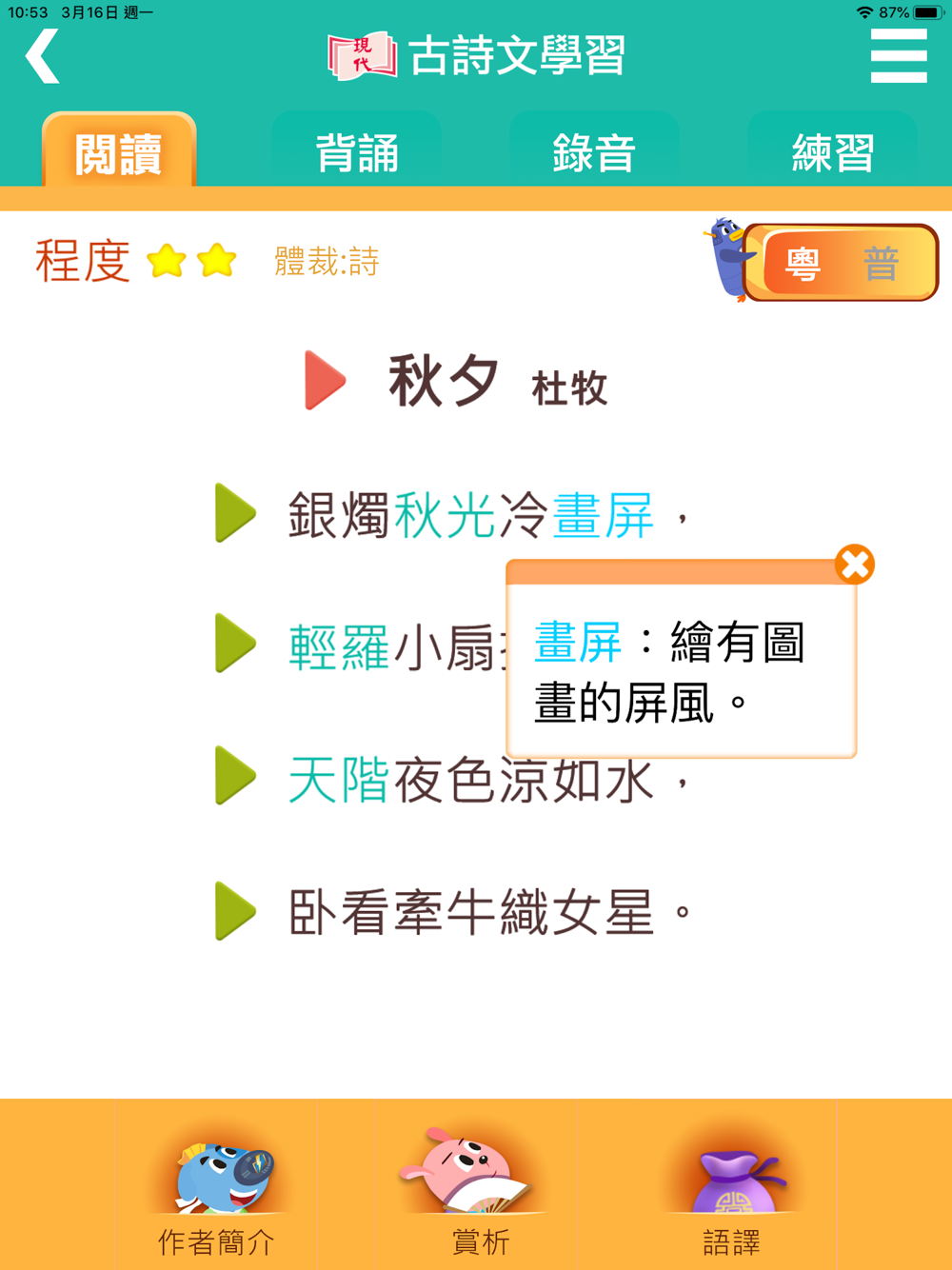每篇古詩文均提供「作者簡介」、「賞析」、「語譯」及「字詞註釋」,並以「反牌」效果輔助學生背誦古詩文。
