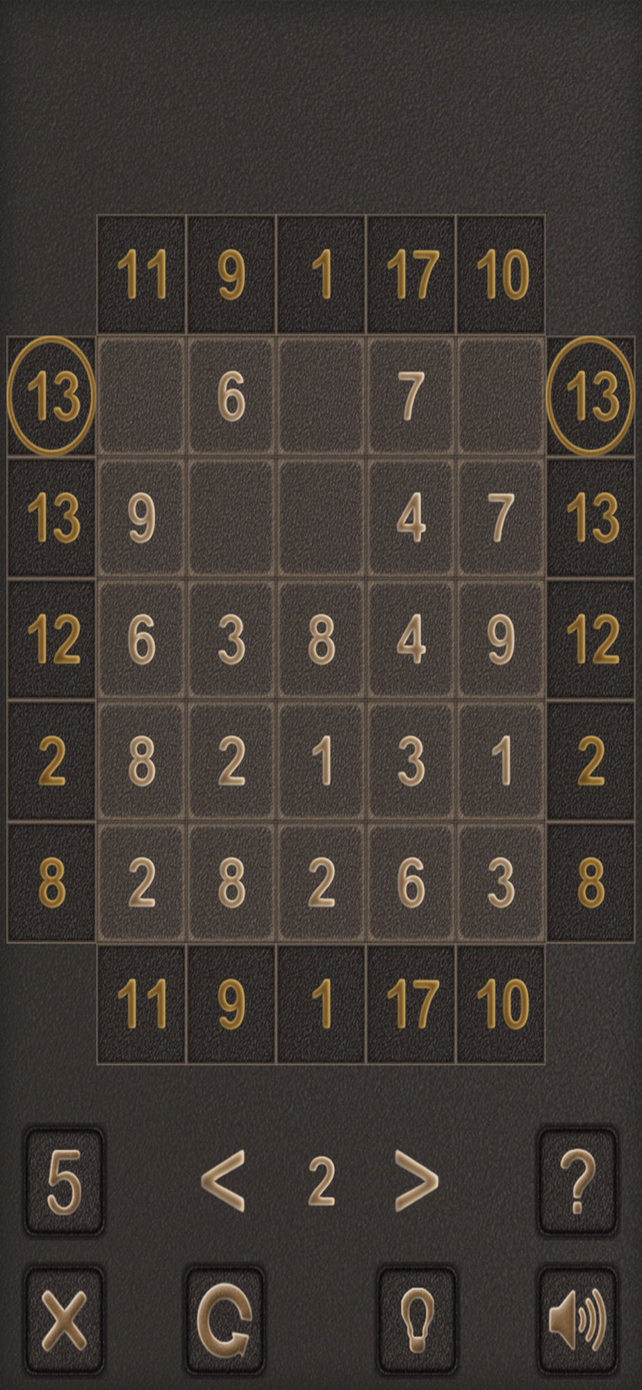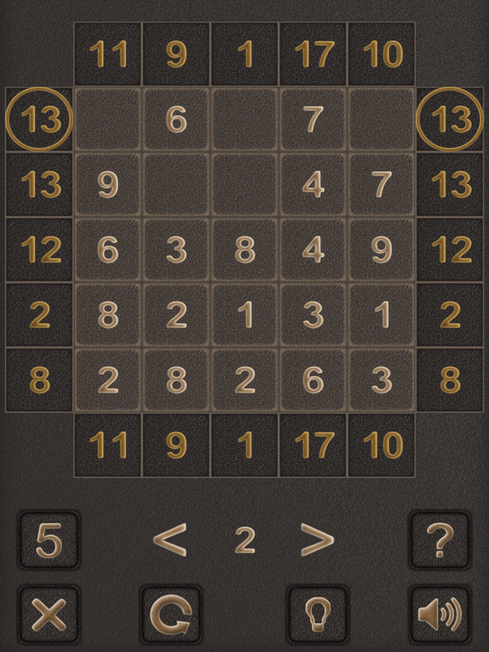 Your goal is to remove redundant numbers from the field. The sum of the remaining numbers in each row or column must coincide with the given numbers, which are indicated along the edges of the playing field.