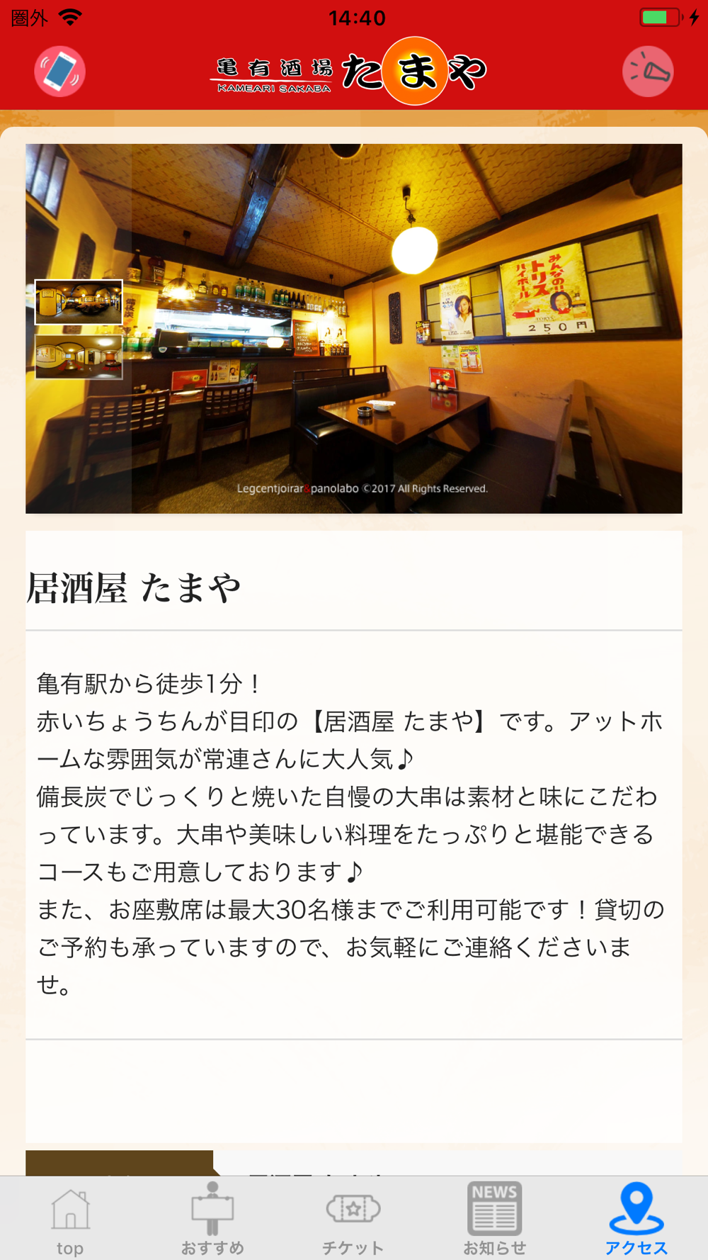360度パノラマ画像でのお店の内観の閲覧や、お店へのアクセスなどの店舗情報の確認、またお得な情報などの最新のお知らせを確認することができるアプリケーションです。