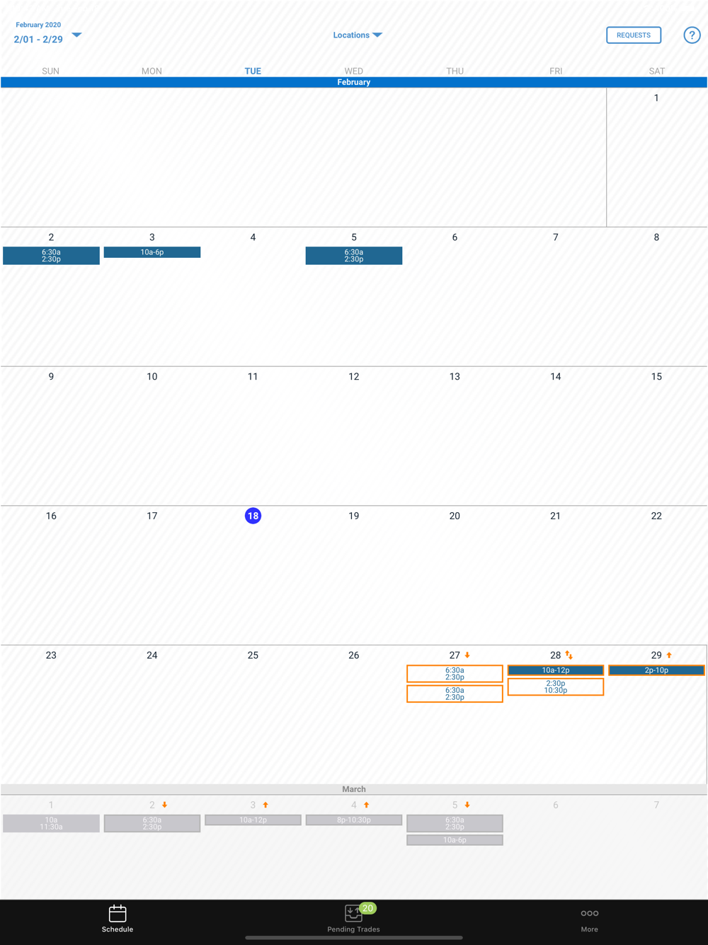 + A clean, monthly calendar view so you can easily see your full schedule; just tap on a day to see who else is working with you